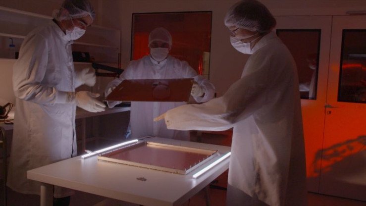 Die Forscher setzen das Myonen-Teleskop zusammen und setzen dazu eine Fotoplatte ein.
