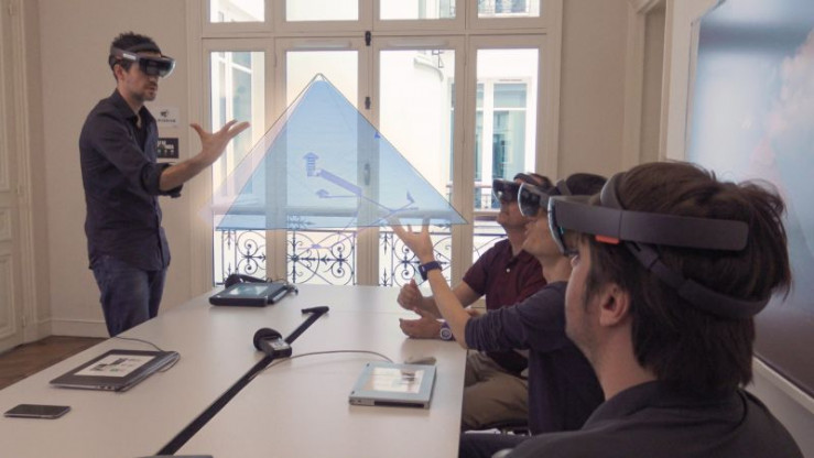 Die Forscher präsentieren ihre Ergebnisse mit einem Modell der Pyramide in erweiterter Realität und tragen dazu entsprechende Brillen.