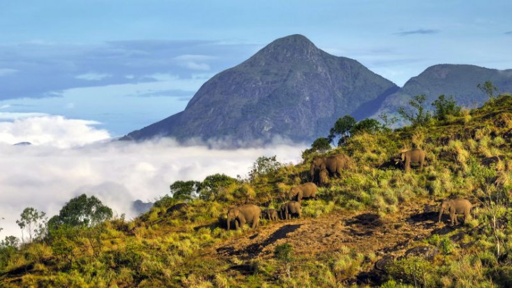 Obwohl sie schwerfällig wirken, erklimmen Asiatische Elefanten auch Gipfel oberhalb der Teeplantagen.