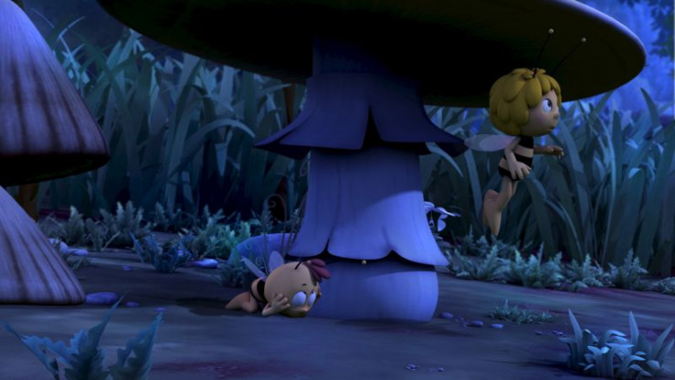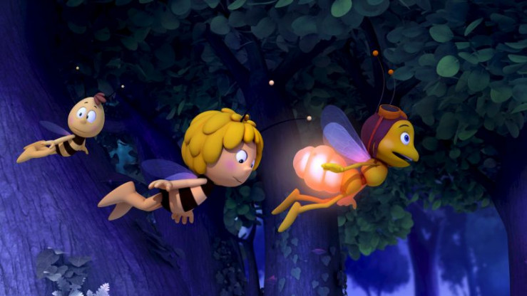 Das Glühwürmchen Glühhannes (r.) zeigt Maja (M.) den Weg.