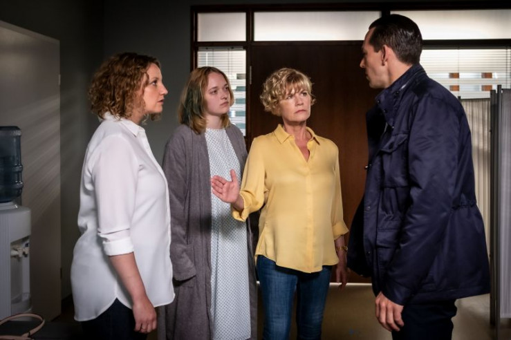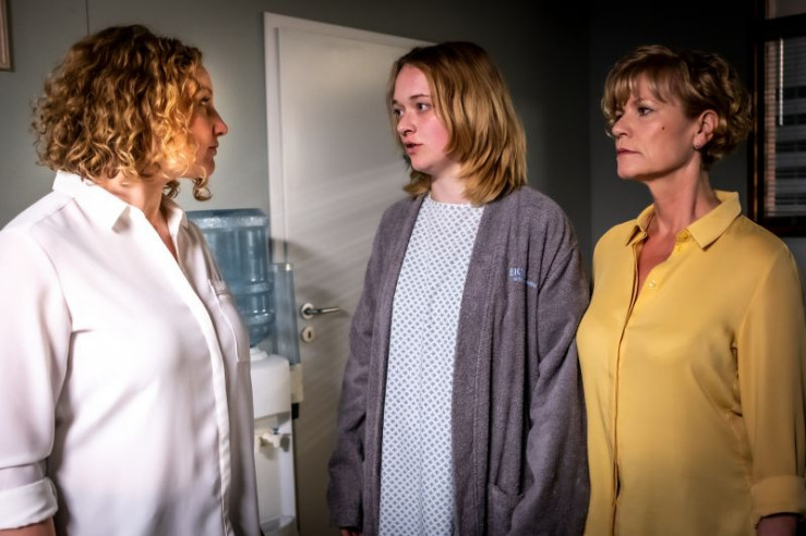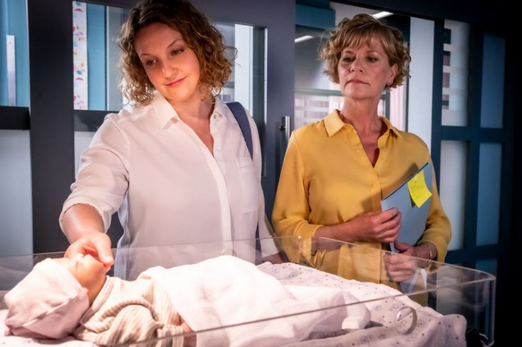 Karin Berger (Anne Kasprik, r.) ist froh, dass sich die Pflegemutter Svenja Richnow (Victoria Fleer, l.) um das Neugeborene kümmern möchte.