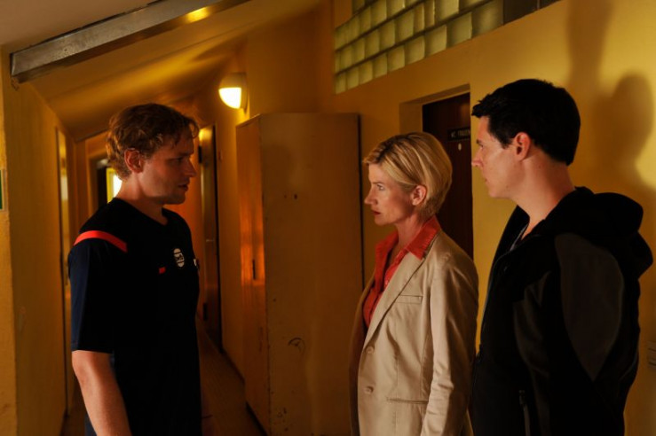 Dennis Pflieger (Florian Rummel, M.) streitet die Missbrauchsvorwürfe vor Martina Seiffert (Astrid M. Fu?nderich, l.) und Rico Sander (Benjamin Strecker, r.) ab. Können sie ihm glauben?
