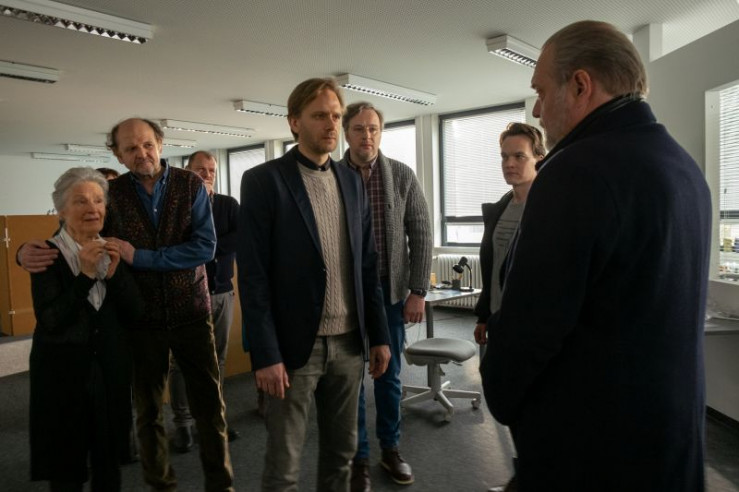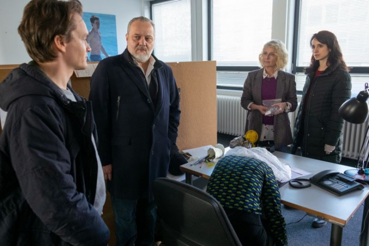 Hauptkommissar Richard Voss (Jan-Gregor Kremp, r.) und Tom Kupfer (Ludwig Blochberger, 2.v.r.) hat eine traurige Nachricht für den Leiter des Krisentelefons Bastian Baumann (Matthias Lier, 3.v.l.) und das restliche Team: Frau Heswald (Kerstin de Ahna, l.), Jan Kern (Norbert Stöß, 2.v.l.) und Korbinian Huttner (Stephan Grossmann, 3.v.r.): Ihre Kollegin wurde ermordet.
