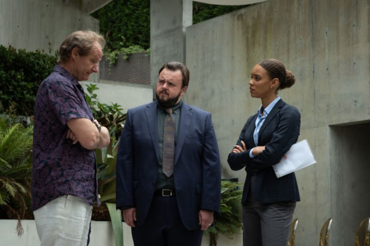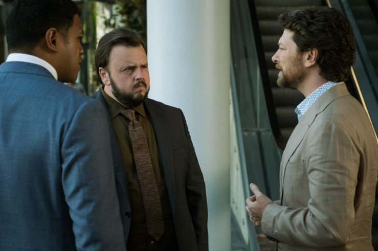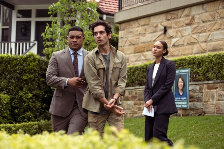 Simon (Dan Spielman, r.) spricht mit den Ermittlern Paea (Chris Alosio, l.) und Max (John Bradley, M.) über sein letztes Treffen mit Sophie.