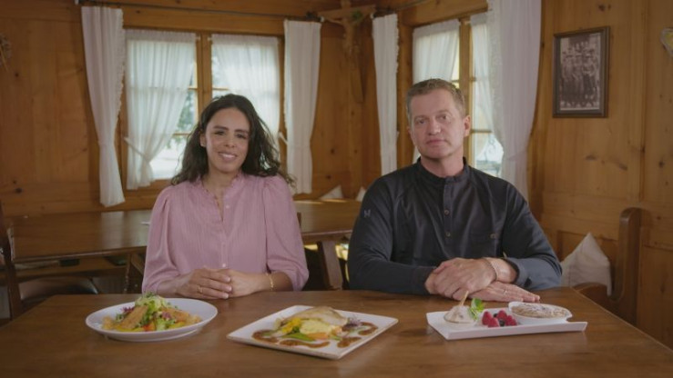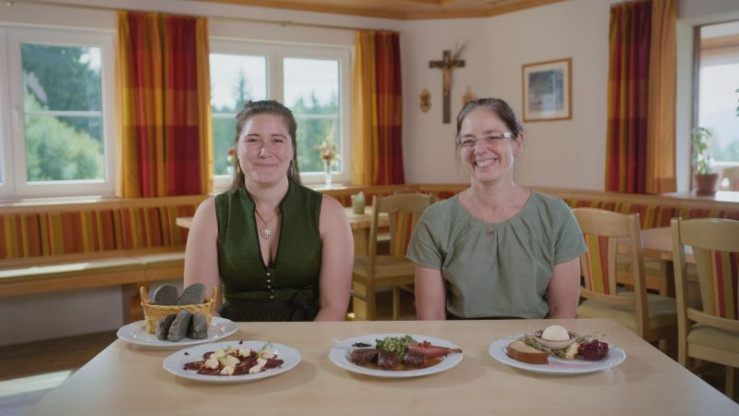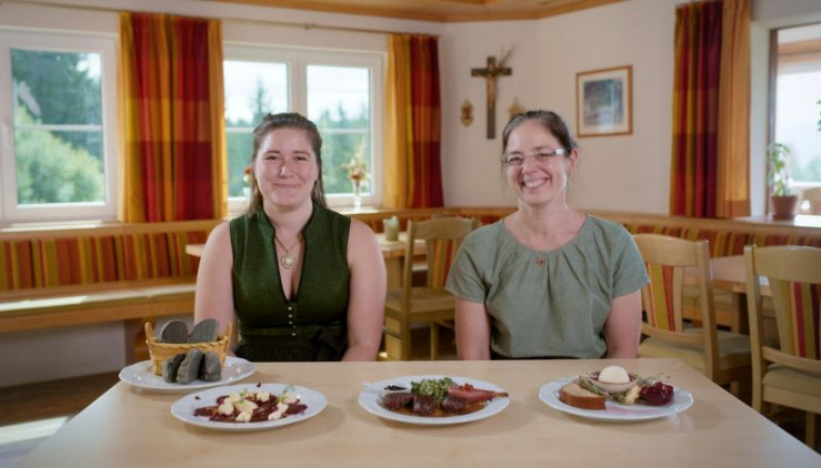 Wirtin Andrea Schwenken vom Berghotel Sonnenklause stellt zusammen mit Tochter Angela das heutige 3-Gänge-Menü vor. Weiteres Bildmaterial finden Sie unter www.br-foto.de.