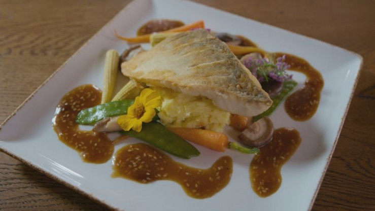 Knusprig gebratener Bodenseezander auf gestampften Kartoffeln mit Babygemüse und einer Sesam-Soja-Glace (Altstaufner Einkehr, Oberstaufen)