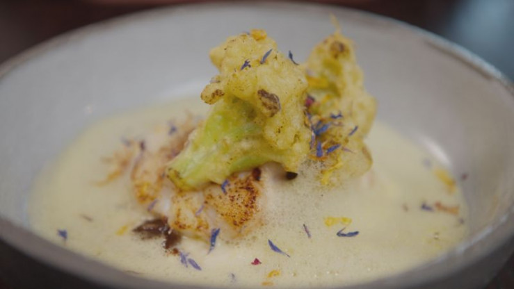 In Butter gebratenes Seeteufelfilet mit Blumenkohlmus, Blumenkohl in Tempura und einer Curry-Nage (Das Maxi, Oberstdorf)