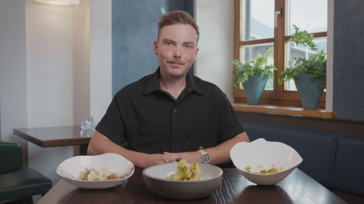 In Fichtenöl gebratene Medaillons von der heimischen Gams mit Brennnesselspätzle, Holunderbeer-Chutney und einer in Mädesüß pochierten Rotweinbirne mit Vogelbeer-Chutney (Kräuterhotel Sonnenklause, Hinang)