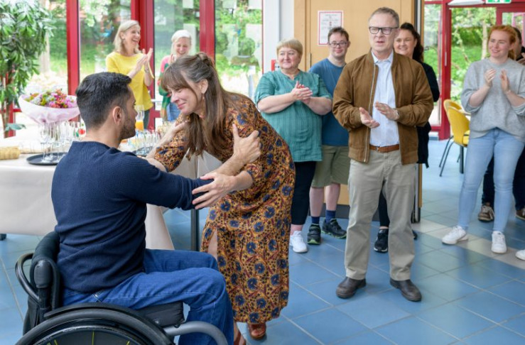 Ralf Hesse (Tan Caglar, l.) gratuliert seiner Mitarbeiterin Lena Schühle (Catherine Bode, 2.v.l.) zur Beförderung. Kollege Ludwig Tober (Helmut Zhuber, 3.v.r. mit Komparserie) klatscht nur bedingt begeistert mit.