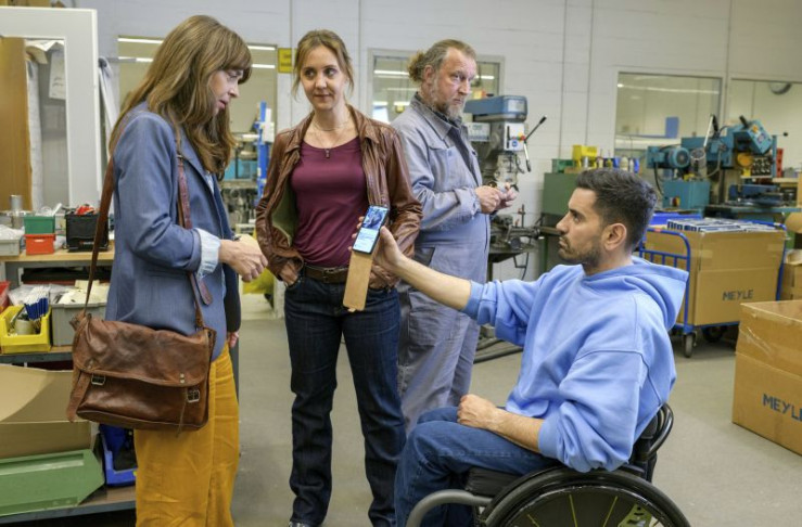 Im Gespräch mit dem Leiter der Behindertenwerkstatt Ralf Hesse (Tan Caglar, l.) versuchen Bente Hinrichs (Sinha Melina Gierke, M.) und Lukas Petersen (Patrick Abozen, r.) herauszufinden, wer dort gegen wen intrigiert.