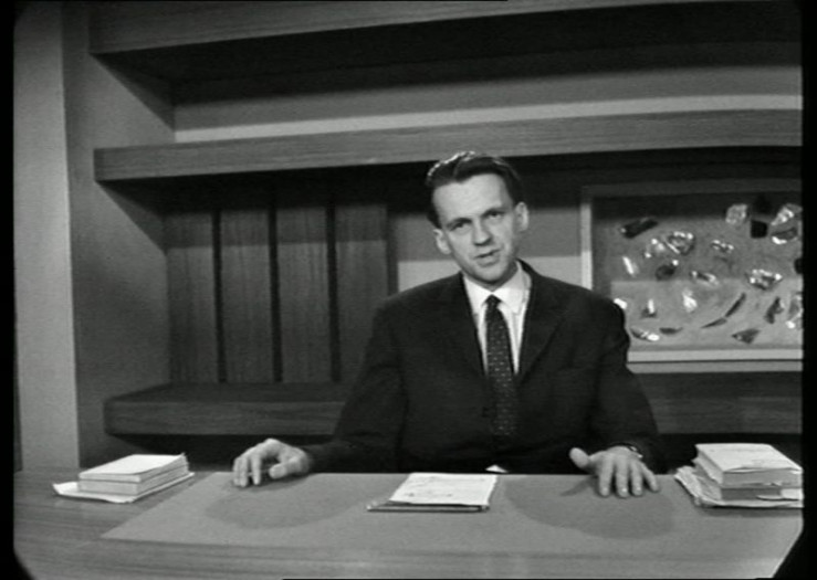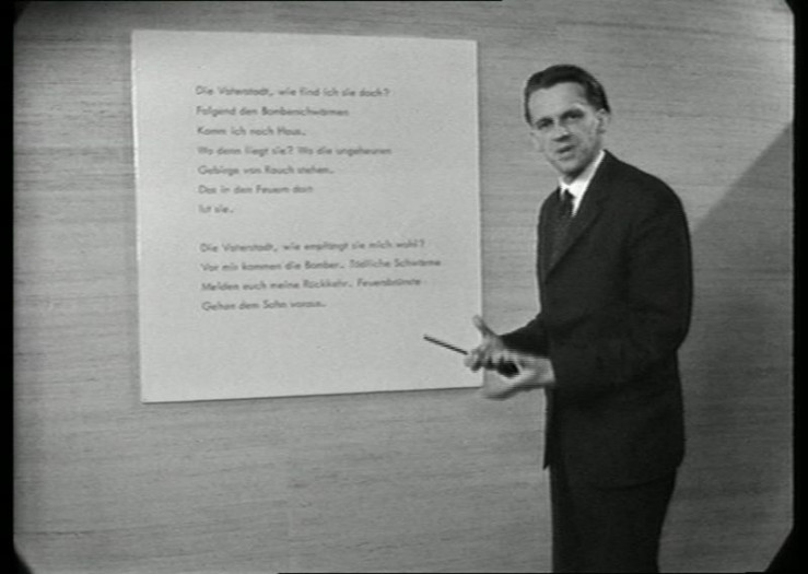 Das Gedicht "Rückkehr" von Bertolt Brecht wird von Walter Jens an der Studiowand erklärt.