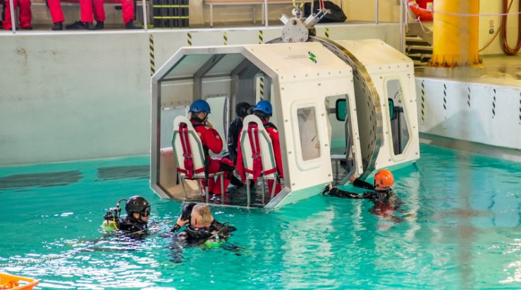 Mit einer Helikopterattrappe wird ein Absturz simuliert. Die Teilnehmenden müssen sich beim Überlebenstraining selbstständig aus dem Helikopter befreien können - auch unter Wasser.