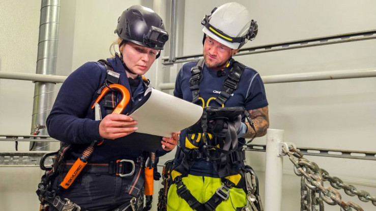 Nicole Betke und ihr Kollege Marc Schaller bei ihrer Arbeit tief im Inneren der Offshore-Windkraftanlage.