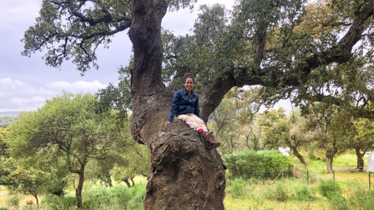 Pia auf einer mehr als 300 Jahre alten Korkeiche. In Spanien erfährt sie, wie der Kork dieser besonderen Bäume geerntet wird.