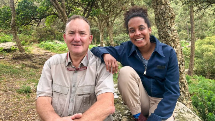 Naturparkführer Rafa (Rafael Cerpa) zeigt Pia, welche besonderen Pflanzen und Tiere im Korkeichenwald leben. Zusammen suchen sie die größte Spinne Europas.