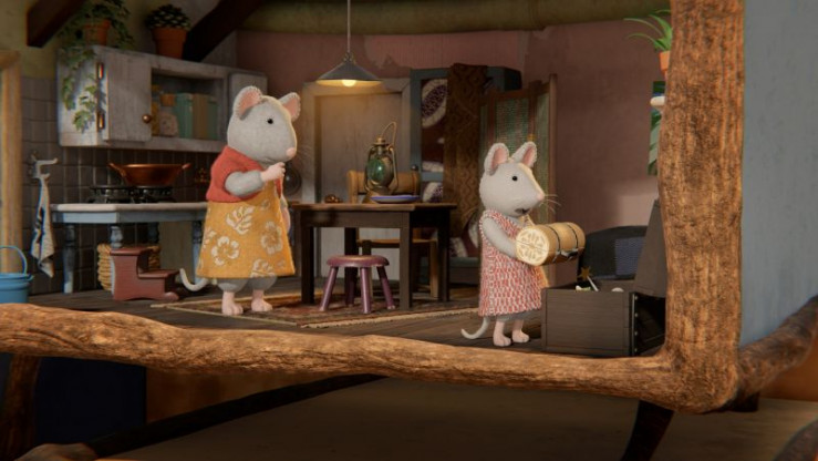 Sam (links) erzählt Julia (rechts), dass heute Abend ein Mitmach-Konzert im Mäusehaus stattfindet. Jeder, der ein Instrument hat, kann mitspielen.