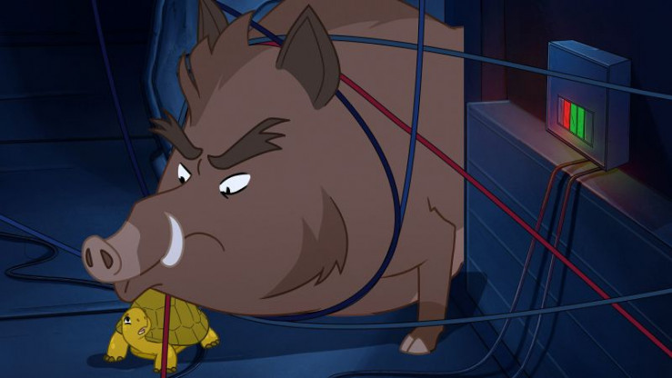 Wie sollen sich Schildkröte Törtel (u.) und Wildschwein Grrmpf aus dieser brenzligen Lage, umgeben von Kabeln und Elektrizität, nur befreien?