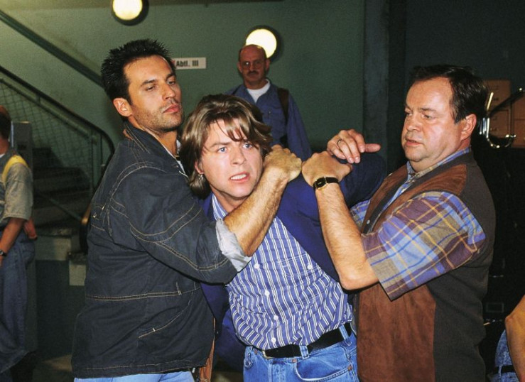 Stefan Kehler (Wolfgang Bathke, re.) und Mike Eschenbach (Matthias Bullach, li.) müssen kräftig anpacken, damit Hardy Bittner (Uwe Fellensiek) sich nicht auf einen der Verdächtigen stürzt.