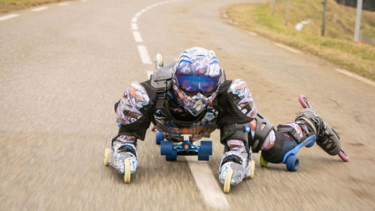 Jean Yves Blondeau is the inventor of the 32-wheel roller suit, the wearer who can ride downhill in a variety of positions at speeds of up to 112 km/h.