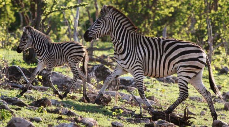 Halsbandzebra 'Socks' mit ihrem neuen Fohlen im Nxai Pan National Park, Botswana