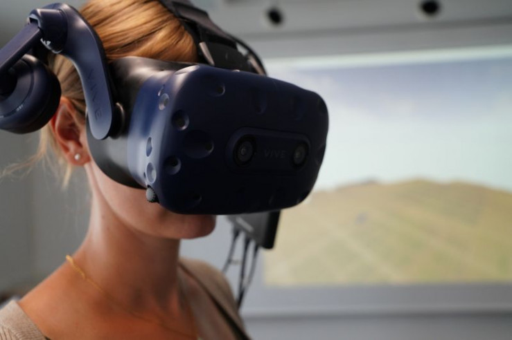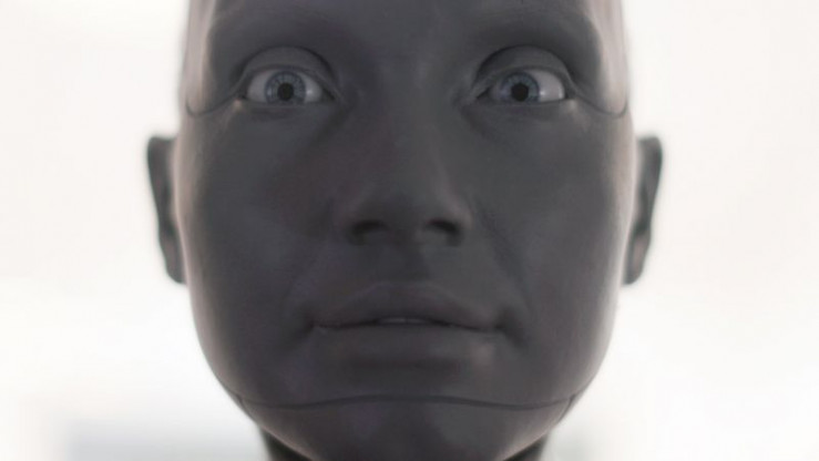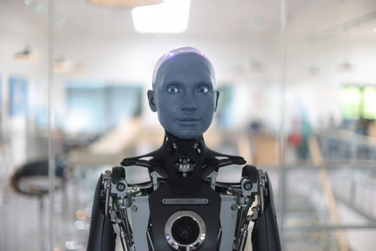 Ameca, ein humanoider Roboter von Engineered Arts, steht im Church View Business Park in Falmouth, England.
