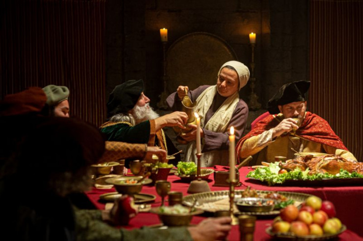 Beim abendlichen Gelage gibt ein Adeliger Anekdoten aus der letzten Schlacht zum Besten.