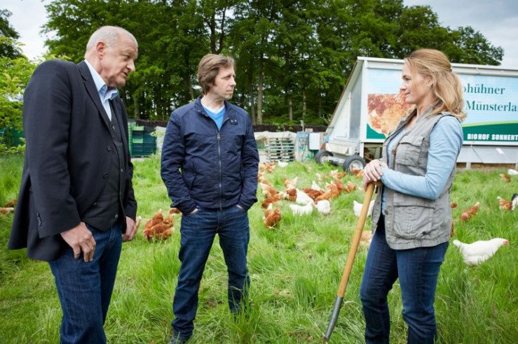 Wilsberg (Leonard Lansink, l.) und Ekki (Oliver Korittke, M.) befragen Anette von Bülow (Sonsee Neu, r.).