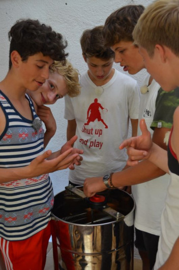 Leroy (l.), Luc (2.v.l.), Robin (M.), Nils (2.v.r.), Ole (r.) machen ihren eigenen Honig.