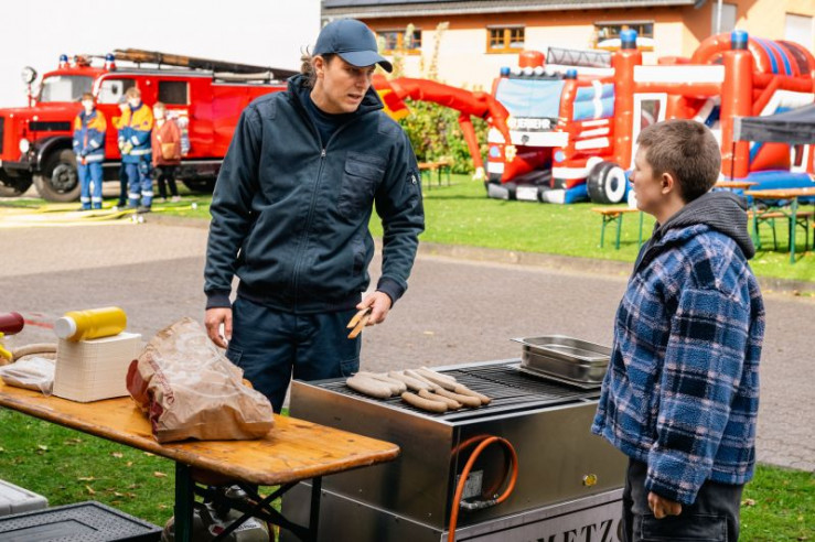 Am Tag der offenen Tür der Freiwilligen Feuerwehr fehlt jede Spur von der Wachleiterin, was besonders ihren Stellvertreter Nils Steiner (Frederik Götz, l.) beunruhigt. Wenig später findet Anwärterin Anne Herder (Malin Assmus, r.) sie tot in der Fahrzeughalle. (Komparsen im Bild)