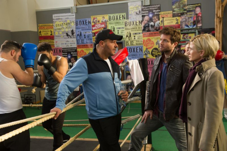 Selma Kirsch (Yve Burbach, l.) versucht herauszubekommen, in welchem Verhältnis der talentierte Boxer Mike Ketsche (Patrick Heinrich, r.) zu seinem ermordeten Trainer stand. Während Jo Stoll (Peter Ketnath, 2.v.r.) über Selmas Engagement erfreut ist, sieht Boxstudioinhaber Ingo Koos (Willi Herren, 2.v.l.) dieses Gespräch mit gemischten Gefühlen.