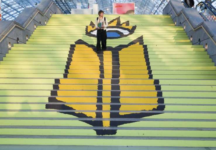Logo der Buchmesse auf der Treppe in der Glashalle.