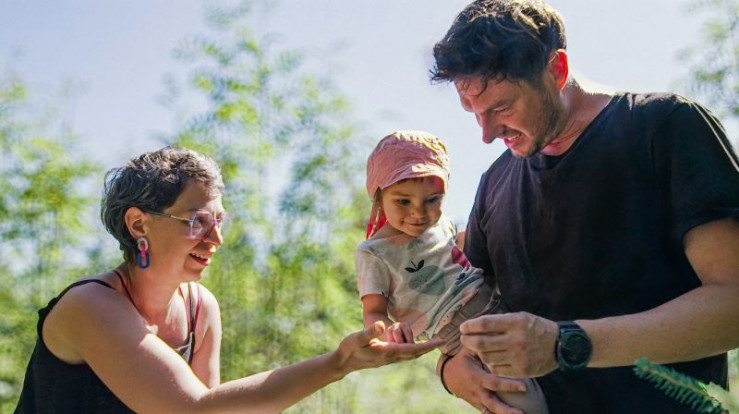 Stella und Andi mit Tochter Zoe auf ihrem Campingplatz. Weiteres Bildmaterial finden Sie unter www.br-foto.de.