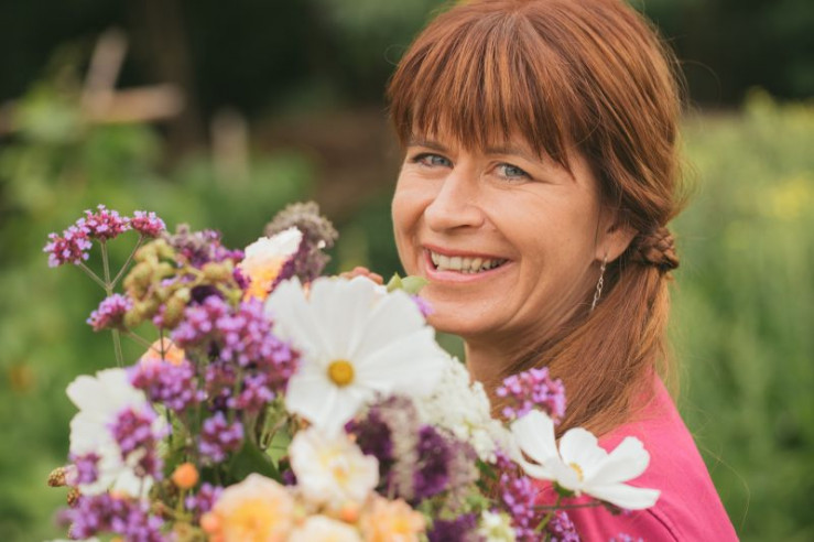 Moderatorin Sabrina Nitsche schneidet im Querbeet-Garten einen sommerlichen Blumenstrauß.