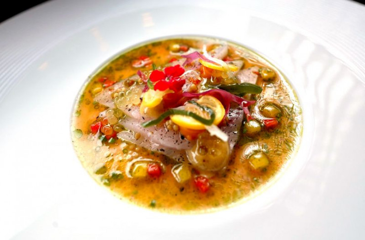Schwertfisch Tradito mit Blutorange, Seetang & Georgsenf von Alexander Mayer (La Vallée Verte, Herleshausen).