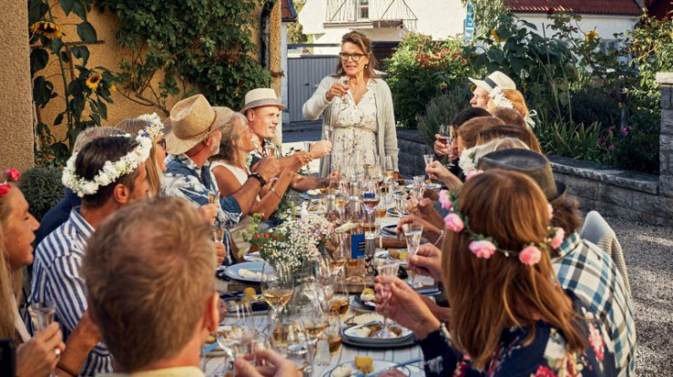 Polizeichefin Annika Fåhréus (Katrin Sundberg) überrascht die Gäste der Mittsommer-Party.