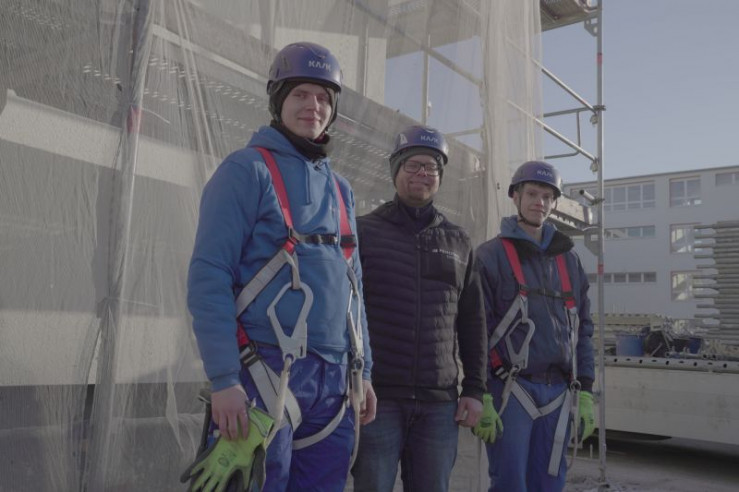Die beiden Lehrlinge Nico (l.) und Nikita (r.) wollen Gerüstbauer werden. Chef Ronny Prinzing (M.) unterrichtet sie in der Praxis.