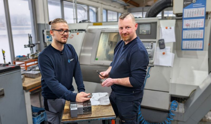 Schlossermeister Patrick Spohner (r.) muss seinem Lehrling Till (l.) noch viel beibringen