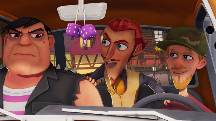 Die drei Dinos Doris, Trina und Socke stehen im Wohnzimmer und hören gespannt auf Leo, der ihnen einige Dinge erklärt.