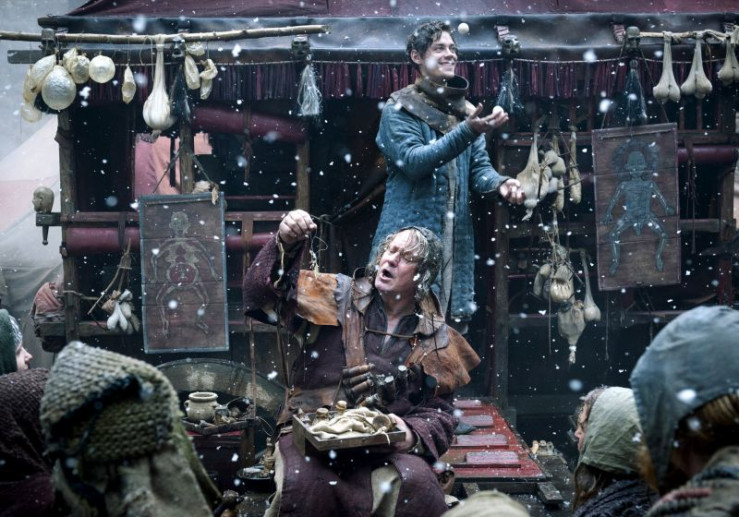 Der fahrende Bader (Stellan Skarsgård, li.) bietet marktschreierisch seine bescheidenen Heilkräfte an. Sein junger Schüler Rob Cole (Tom Payne) unterhält die potentielle Kundschaft in der Zwischenzeit mit kleinen Kunststückchen.