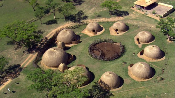 Diese moderne Rekonstruktion zeigt einen so genannten Kraal, also eine Siedlung mit Gehege für das Vieh