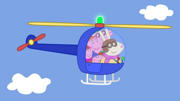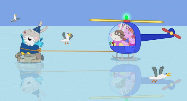 Frau Mümmel und Familie Wutz (o.) retten Opi Mümmel (u.) mit einem Hubschrauber von einem schneebedeckten Berg. Nachdem er mit seinem Raketenrucksack hoch hinaus schießt steckt er dort fest. +++ Die Verwendung des sendungsbezogenen Materials ist nur mit dem Hinweis und Verlinkung auf RTL+ gestattet. +++