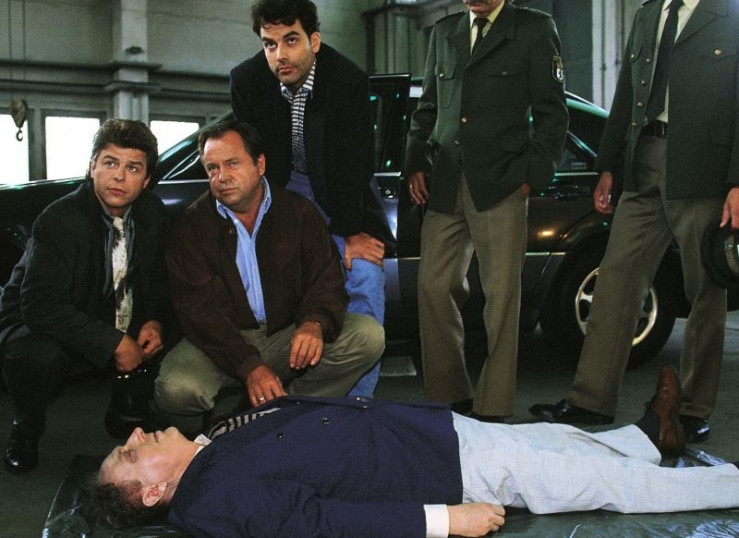 Kriminalkommissar Peter Wolniak (Uwe Fellensiek, l.) und Kriminalhauptkommissar Stefan Kehler (Wolfgang Bathke, 2.v.l.) untersuchen die Leiche des Gemüsehändlers Kuchel. (restliche Personen Komparsen)