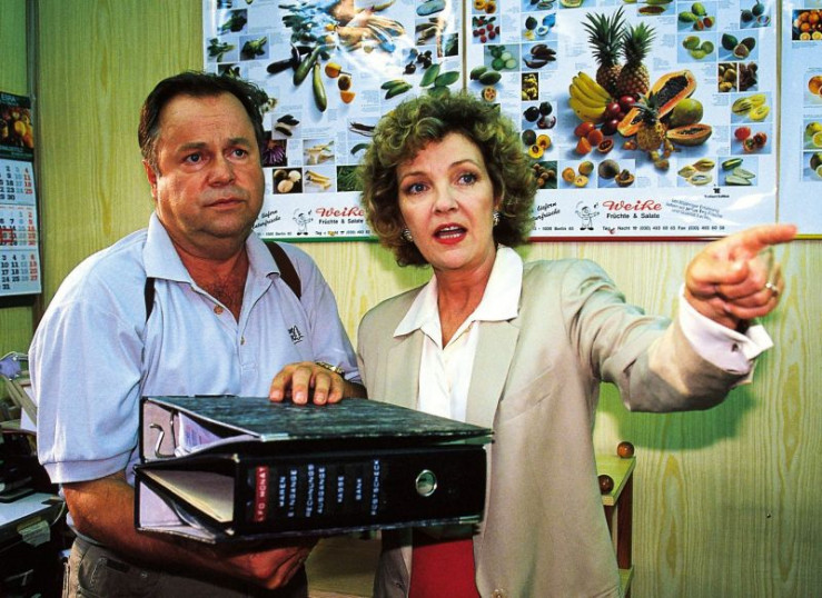 Kriminalhauptkommissar Stefan Kehler (Wolfgang Bathke) unterhält sich mit der Gemüsehändlerin Frau Kuchel (Gilla von Weitershausen).