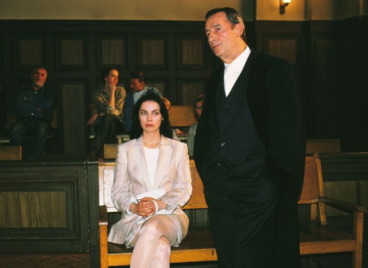 Obertaatsanwalt Lotze (Henry van Lyck) befragt Elena Ehrenreich (Sabine von Maydell) im Zeugenstand zu dem Mord an einem Kaufhausdetektiv.