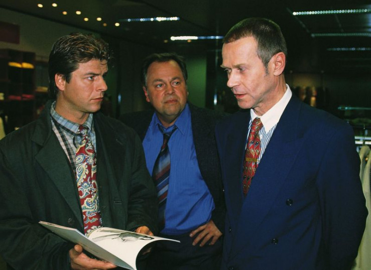 Herr Sommer (Gerd Blahuschek, r.) wird von den beiden Kommissaren Wolniak (Uwe Fellensiek, l.) und Kehler (Wolfgang Bathke) über seine Mitarbeiter des Kaufhauses vernommen.