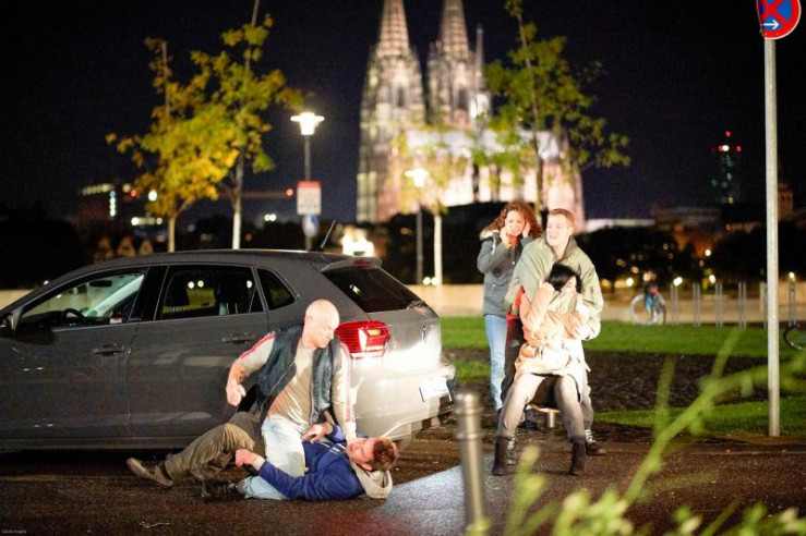 Alexander Gräbner (Johann Fohl, l.) greift Simon Wagner (Thomas Scharff, liegend) an. Ronny Novak (Kai Klima, r.) hat Nora (Mimi Fiedler) fest im Griff. Währendessen ruft Ella (Ines Quermann) die Polizei.