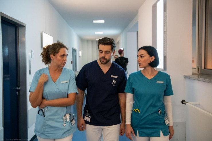 Ella (Ines Quermann, l.), Karim (Nassim Avat) und Nora Altmeyer (Mimi Fiedler) unterhalten sich auf dem Flur des Krankenhauses.