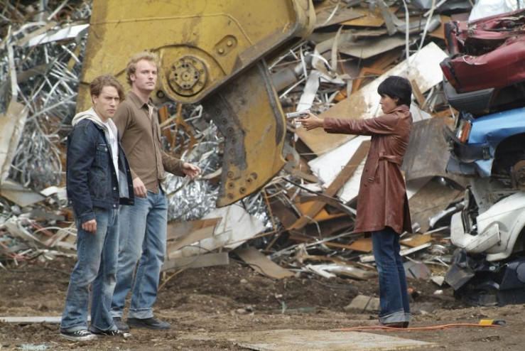 Kaum hat Sven (Mark Waschke, Mi.) Thilo (Adrian Topol, li.) aus Lennerts Schusslinie gebracht, da steht Anja (Mandala Tayde) plötzlich mit gezogener Waffe vor ihnen...