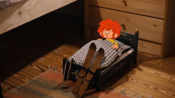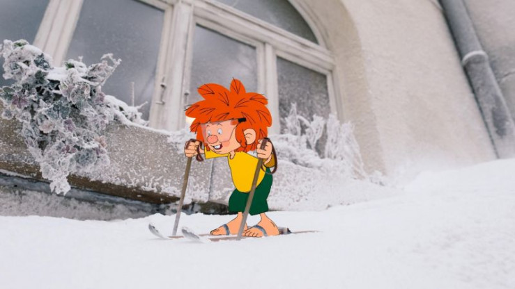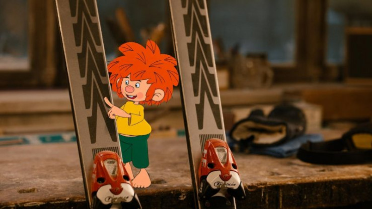 Da kommt Eder eine Idee. Als Entschuldigung schreinert er dem Kobold ein kleines Paar Ski und baut ihm sogar einen Lift. Und so kann Pumuckl wenig später doch noch Skifahren: Auf einem kleinen Schneehügel im Innenhof.