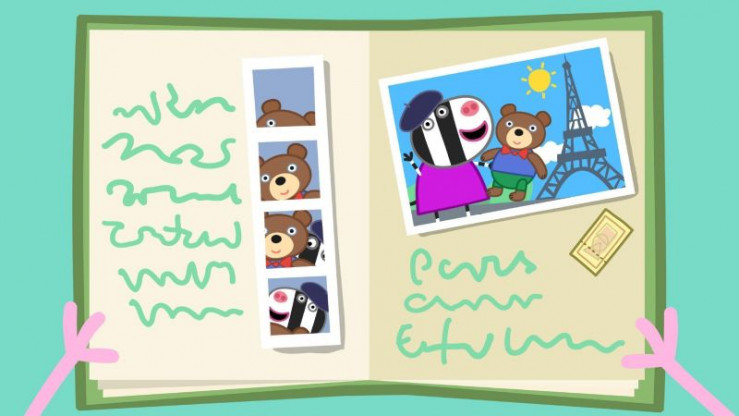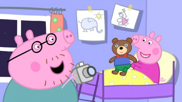Papa Wutz (l.) schießt ein Erinnerungsfoto von Peppa (r.) und Teddy Lausbub. +++ Die Verwendung des sendungsbezogenen Materials ist nur mit dem Hinweis und Verlinkung auf RTL+ gestattet. +++